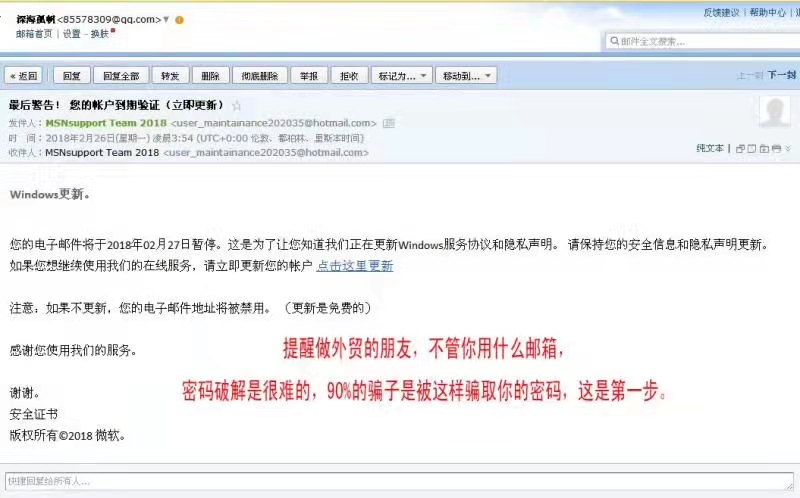 各位外貿(mào)朋友,這是我剛剛收到的一封騙取郵箱帳號(hào)和密碼的郵件,我使用的是hotmail的郵箱,這種郵件一般是群發(fā)的,一般外貿(mào)匯款詐騙,就是這樣開(kāi)始的: